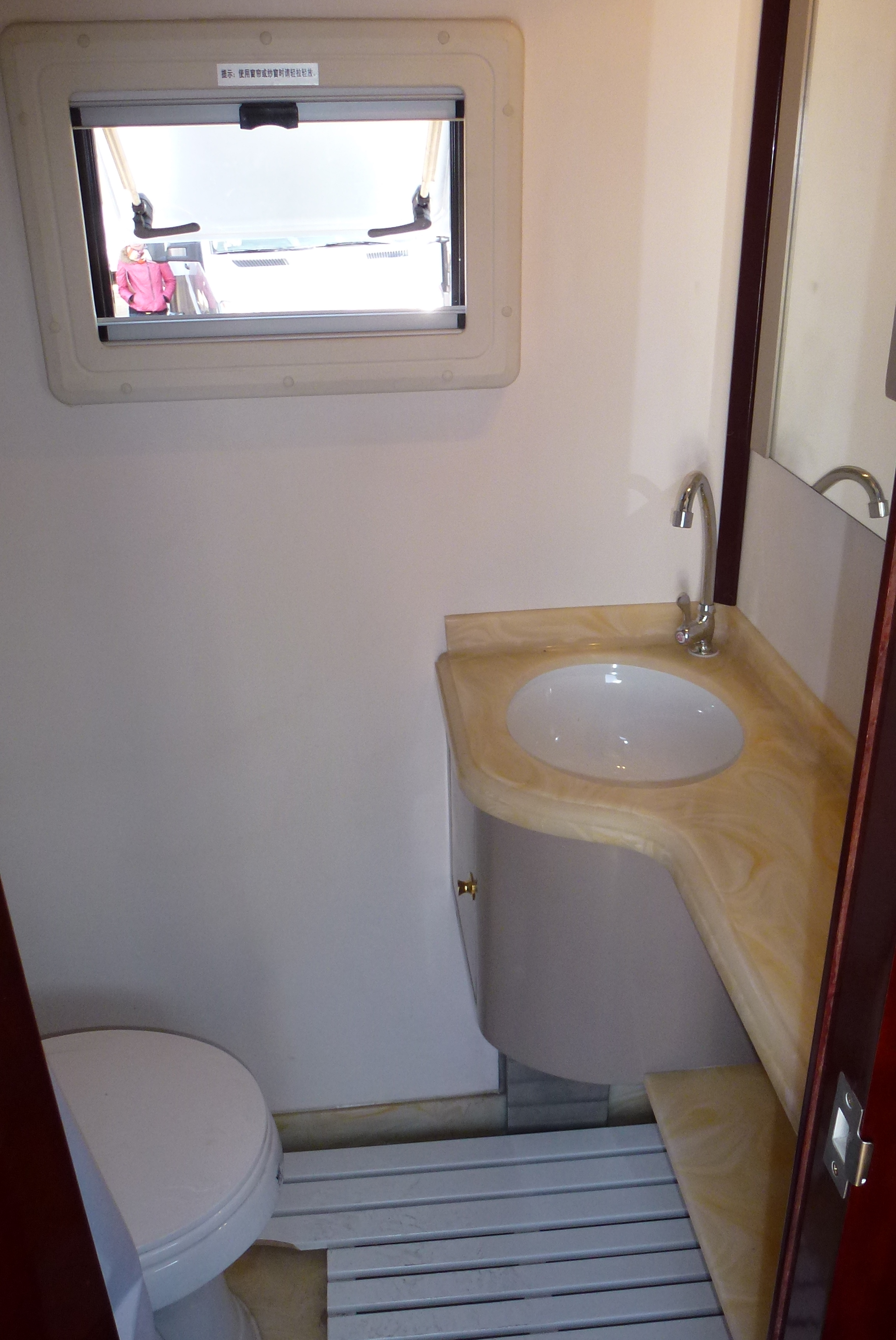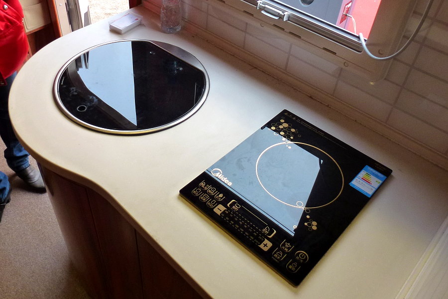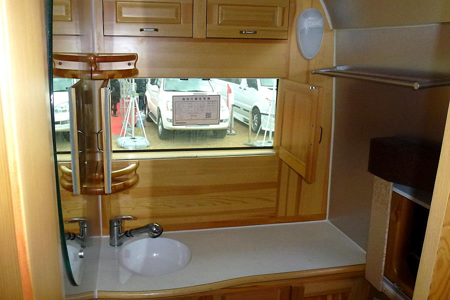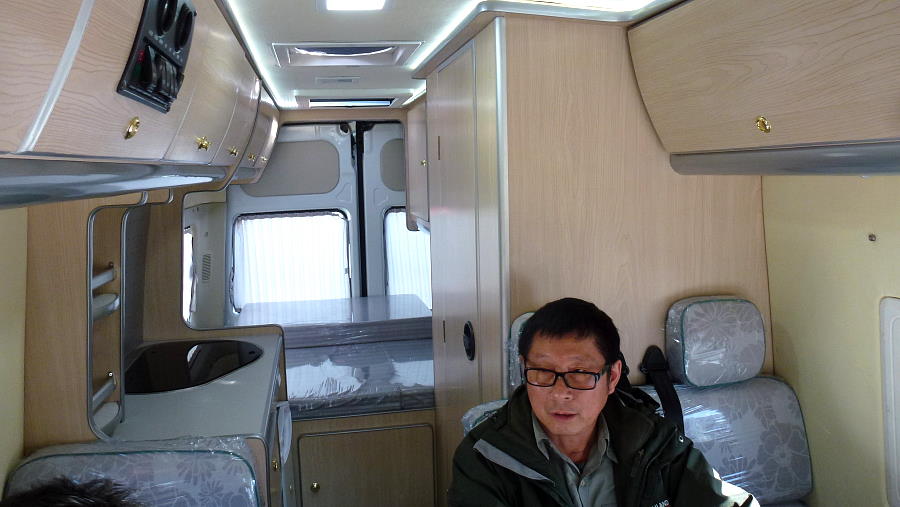 Wir sahen zwei Wohnmobile die auf dem Sunray von der Firma JAC basierten, ein privater auf dem 'Red Ants' Gelände und einer auf dem Ausstellungsgelände, beide von der Firma Qixing ausgebaut. Der Sunray hat eine gewisse Ähnlichkeit mit dem Mercedes Sprinter. Der Innenausbau war hell und modern.