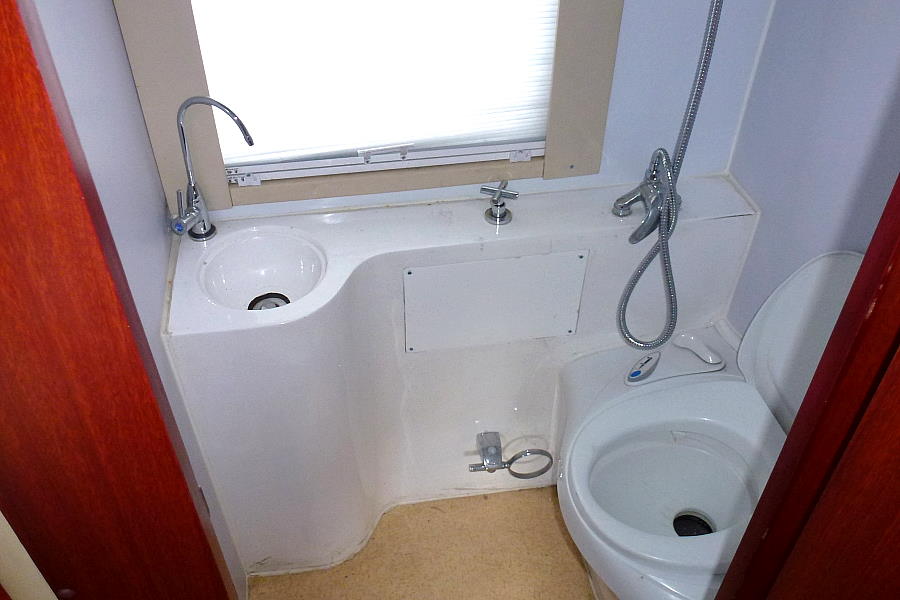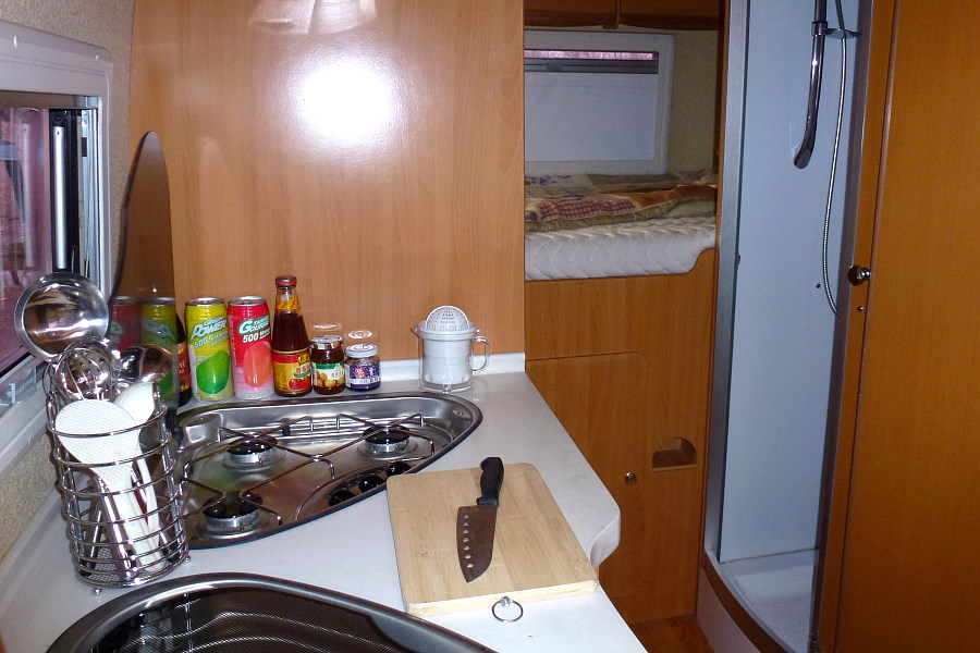 Im Heck eine Küche zum Kochen, mit Kühlschrank und dem obligatorischen Generator.