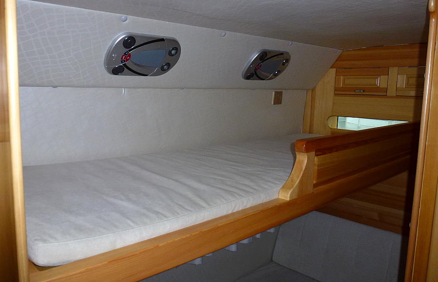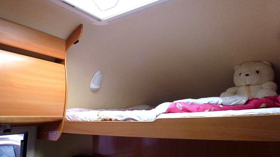 Viele sinnvolle Ausstattungsdetails machen das Leben hier bequem. Das Innendesign war modern, hell und freundlich mit großem Bett über der Heckgarage und einer vollständigen Sitzgruppe. Nur das Alkovenbett sah etwas niedrig aus.