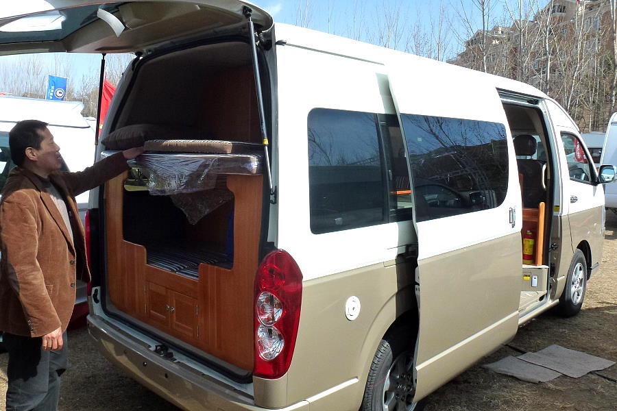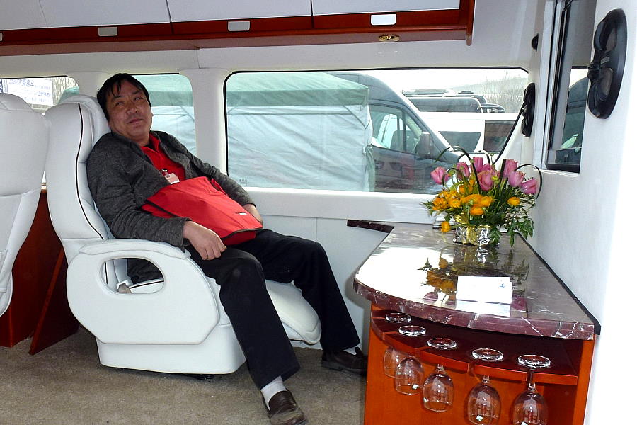 Die Yihong Gruppe aus Xiamen ist in erster Linie als Hersteller von Luxusyachten bekannt. Hier präsentieren sie einen Busausbau der mit europäischen Innendesigns wenig gemein hat. Es ist halb Büro, halb Wohnung, und es gibt auch immer ein paar Fahrersitze im Wohnbereich für weitere Gäste. Besonders nette Standbetreuung mit der wir uns lange über die deutsche Firma Dehler unterhalten haben.