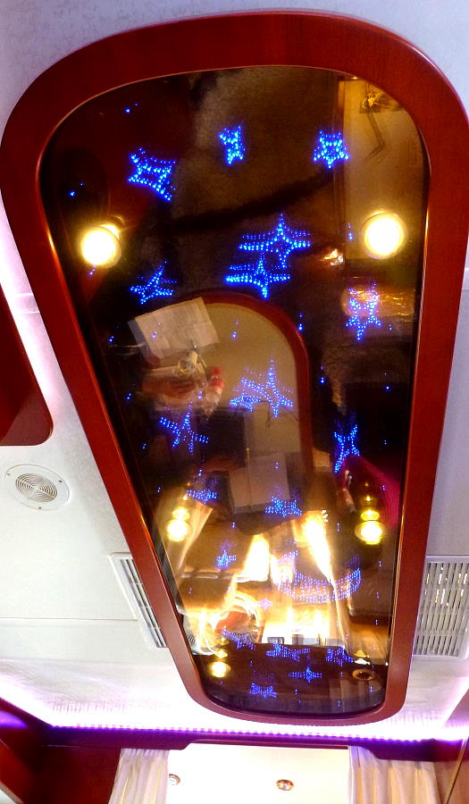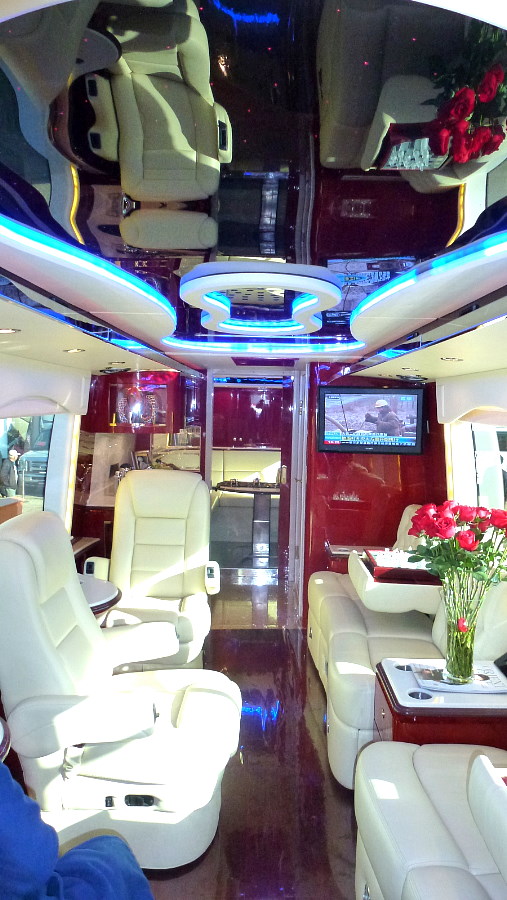 Im Inneren sieht man puren Luxus: einen Spiegelhimmel, LED Farbbeleuchtung, weiße Lederpolster, eine Bar und weiteres. Diese ist mehr ein rollendes Wohnzimmer um den Abend mit Freunden zu verbringen als ein Wohnmobil in dem gelebt wird.